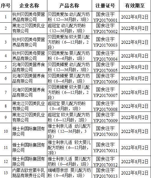 8月3日,国家食品药品监督管理局官方网站公布了首批获得婴幼儿乳粉配方注册的22个企业89个配方,其中有外资企业5家,国内企业17家。