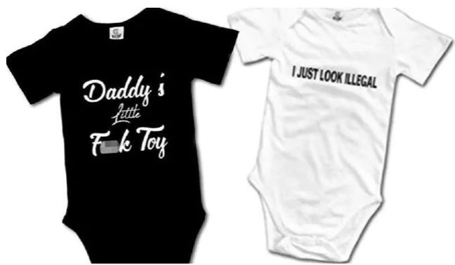 据Sun在线调查发现,亚马逊网站上销售印有不合适内容的儿童连体衣。在亚马逊美国网站上,新闻媒体发现在售的两个婴儿连体衣上有令人作呕的口号。黑色的连体衣上印有 “Daddy’s little fuck toy”的内容,白色的连体衣上则写着 “I just look illegal”。这两件连体衣的零售价格约为20美元,适合0到24个月大的婴儿。