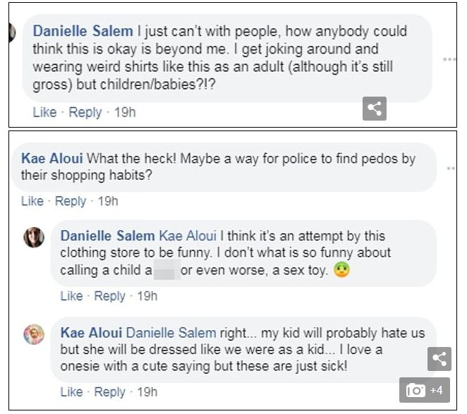 一位用户在社媒上发表评论说:“我无法与这些人相处,他们有病。作为一个成年人你可以开玩笑,但婴儿穿着这样的衣服真的让人恶心”。用户回复称:“我认为这家服装店是为了搞笑而做的尝试,但孩子穿这样的衣服太恶心了,他会因此讨厌我们”。