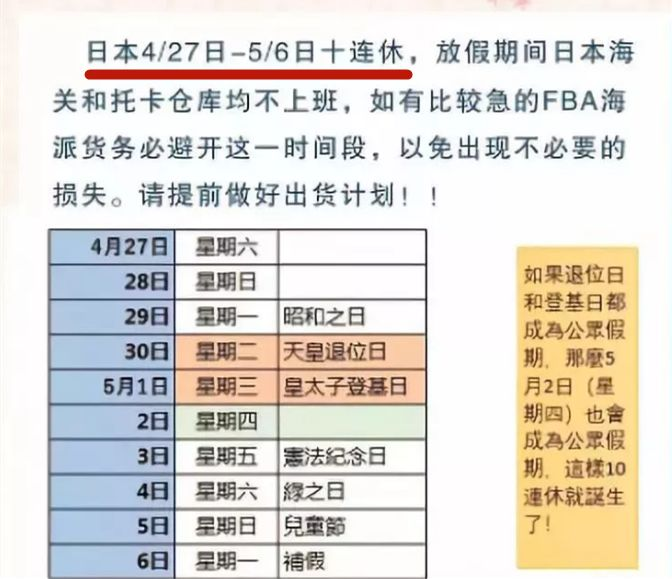 但是日本居民貌似对这一个长达10天的长假并不满意呀,而且兢兢业业的卖家们还将遭受货物清关和派送将产生延误的暴击!