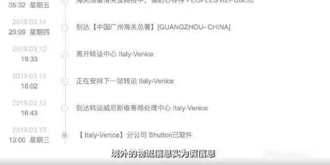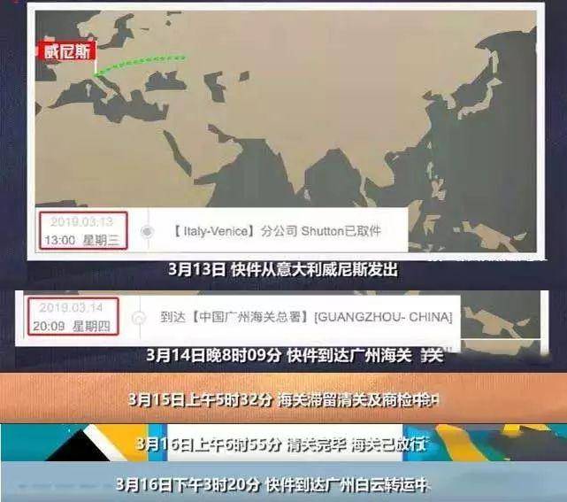 3月13日,快递从意大利威尼斯发出;3月14日,快递到达广州海关;3月15日,海关滞留清关以及商检;3月16日,清关完毕,海关已放行。这个清关速度显然比真实情况快了不少。