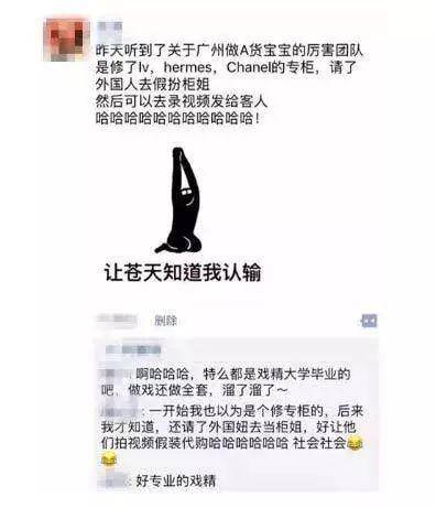 17年年底,曾有网友曝光,某广州A货团队为了增加自己产品的“可信度”,专门修了一个专柜。其中包括LV、Hermes、Chenel等奢侈品的专柜,还请了外国人去假扮柜姐!