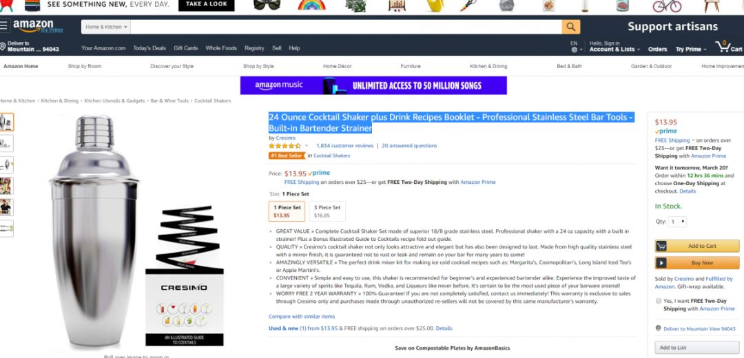 功能简单易用,内置专业振动筛与24盎司容量内置过滤器,不仅适合老道的调酒师,也适合初学者使用。从产品的评论数量来看,这样的调酒神器是有一定的市场。