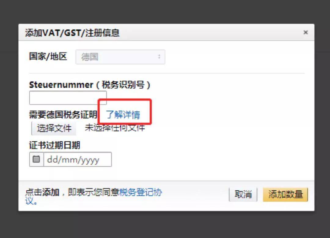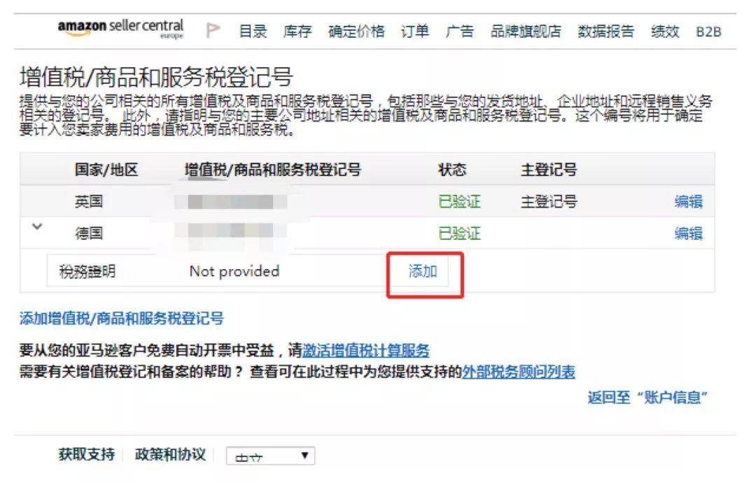 2.选择德国税务证明或德国增值税税号后的“添加”按钮