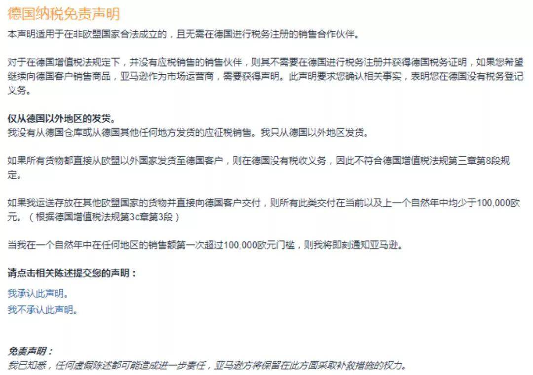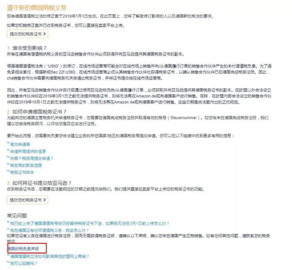如果您德国税务尚未合规,请尽快采取以上两种行动,否则如果您属于在欧盟境外注册的销售伙伴,且未采取适当行动,您将不能继续经营www.amazon.de站点,或向德国消费者销售商品。如果您被要求进行德国税务注册,请点击下方链接,查看往期微信公众号文章查找如何上传您的税务证书。