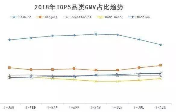 2018年上半年,Wish平台Fashion(时尚品类)、Gadgets(3C消费电子)、Accessories(配饰配件)、Home Decor(家居用品)、Hobbies(兴趣爱好)等是平台GMV占比最高的5个品类,而这5大品类,在2018年上半年表现出不同的发展趋势: