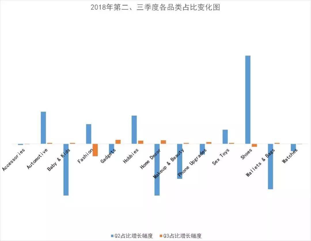 相较于第一季度,2018年第二季度Shoes(鞋靴品类)、Automotive(汽配品类)、Fashion(时尚品类)、Hobbies(兴趣爱好)等品类的GMV占比呈现上升趋势,尤其是Shoes(鞋靴品类),GMV占比增长了超过20%;