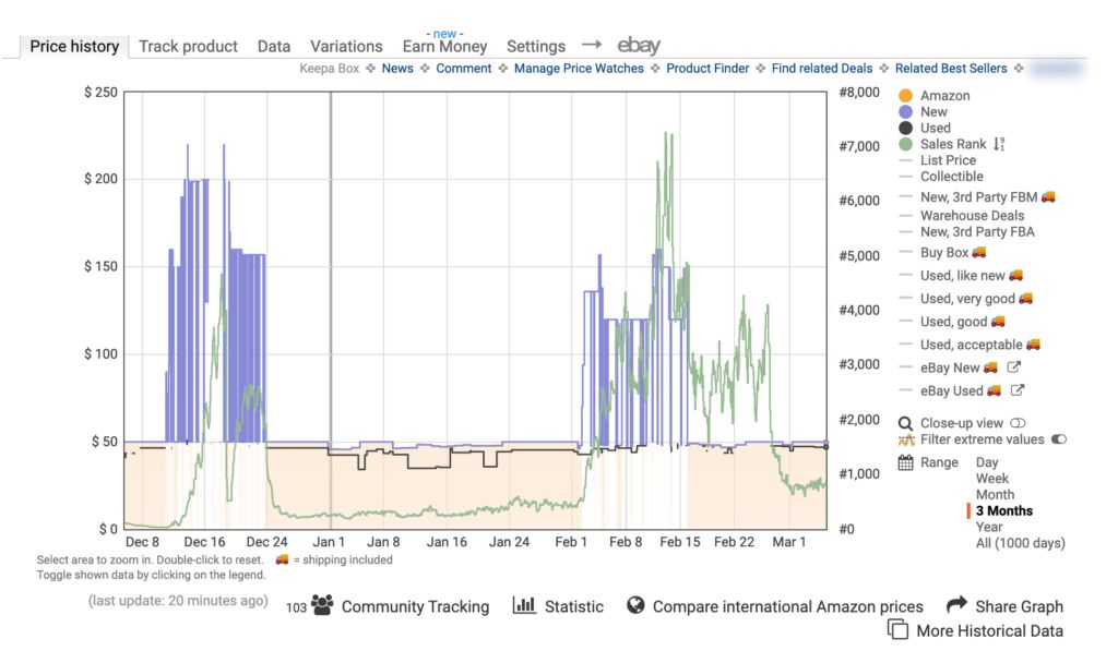 所以说,最准确的补单风向标就是看我们的best seller rank, 比如我们用Keepa随意点开一个爆款产品,如果BSR曲线走势只要没有明显波动,我们就可以按照之前节奏来即可,BSR曲线一旦出现波动,那么就是提醒我们进行补单的警讯了。