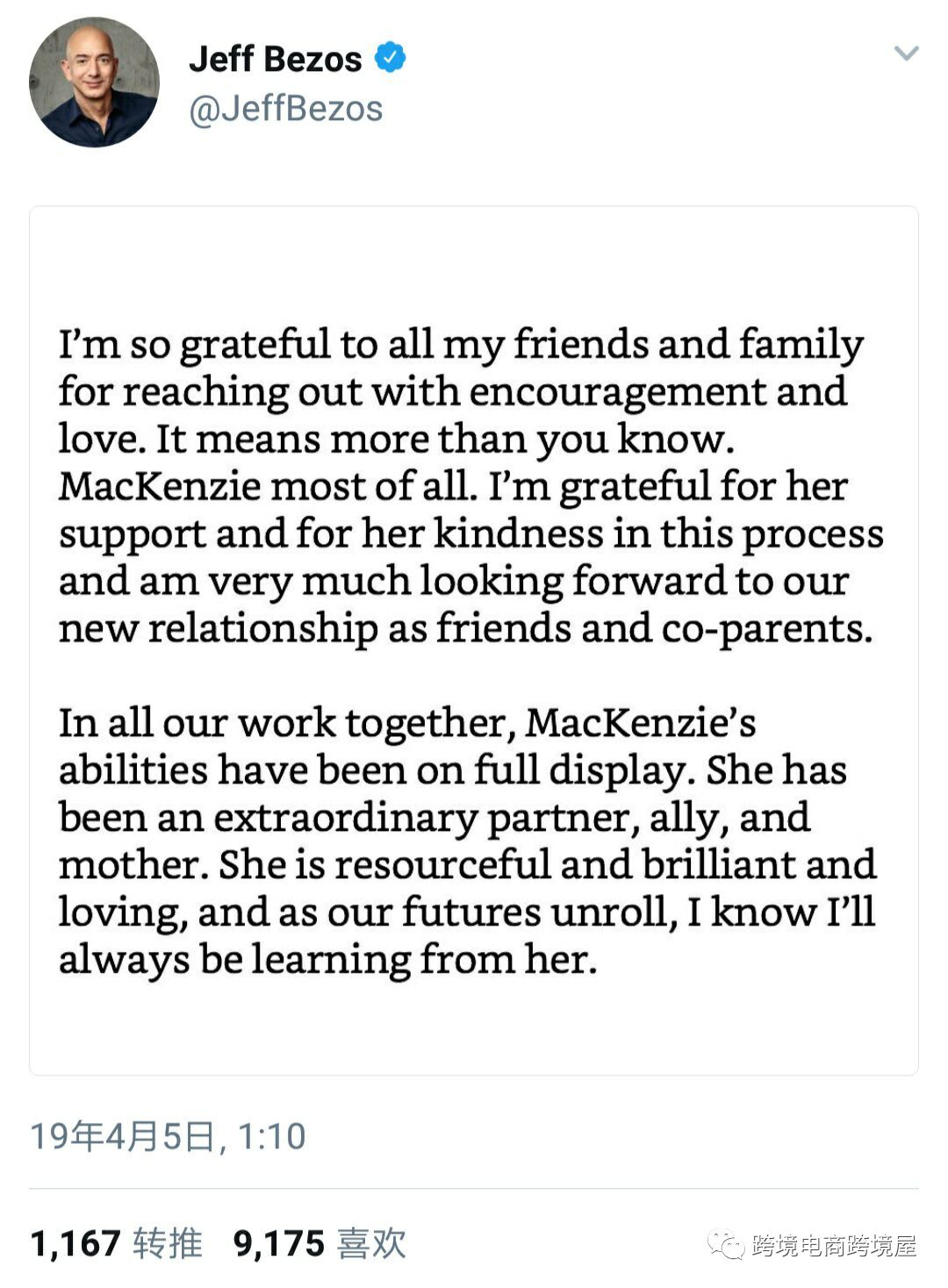 姐夫几乎即时转推了前妻的Twitter,用了相同的图文格式,他表达了对麦肯齐的赞赏:她是一位了不起的伴侣,盟友和母亲。她资源丰富、才华横溢、充满爱心,我知道我将永远向她学习。