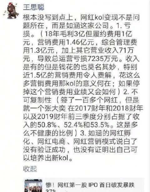 昨日一张王思聪朋友圈对如涵亏损的分析也上了热搜。如涵的亏损“收入有,但是钱花的也莫名其妙,特别是近1.5亿的营销费用令人费解,花这么多营销费用,那KOL的意义何在?”