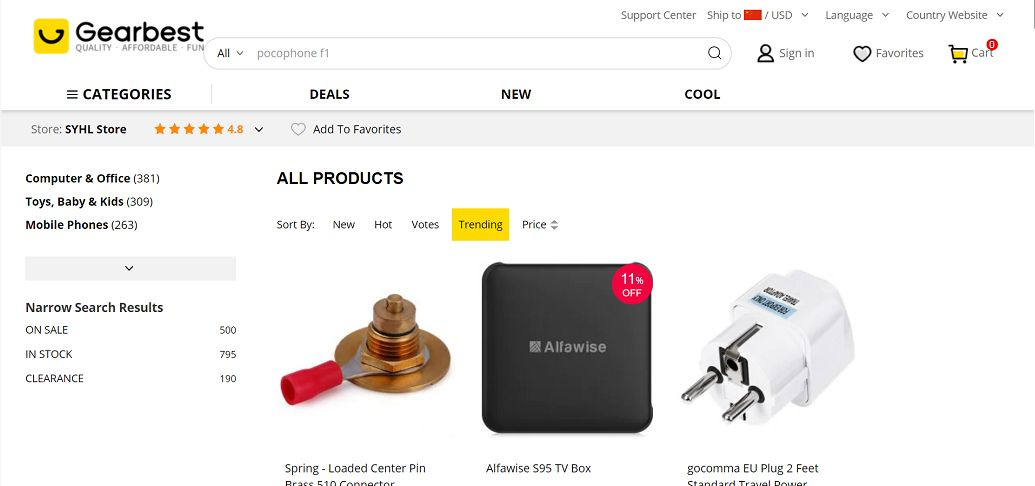 目前,GearBest第三方入驻卖家销售商品的页面右上角会显示该卖家的店铺名字、店铺评分。通过点击店铺评分右边的“Favorites”按钮,用户能直接关注该卖家的店铺。现在,GearBest的店铺页面暂时只有商品的罗列,并不像国内的天猫、京东等电商平台一样拥有店铺装潢等功能。