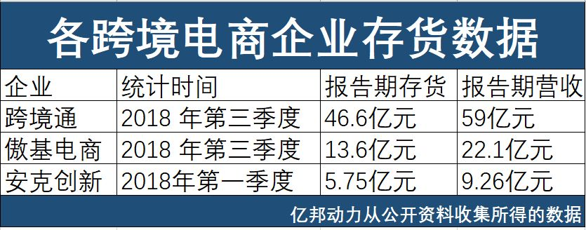 根据公开资料显示,2018年第三季度,跨境通存货资产为46.6亿元,而该报告期跨境通的营收为59亿元;同为2018年第三季度,傲基电商存货资产为13.6亿元,而该报告期傲基电商的营收为22.1亿元;在2018年第一季度,以出海品牌为主要模式的安克创新存货资产为5.75亿元,而该报告期内安克创新的营收为9.26亿元。