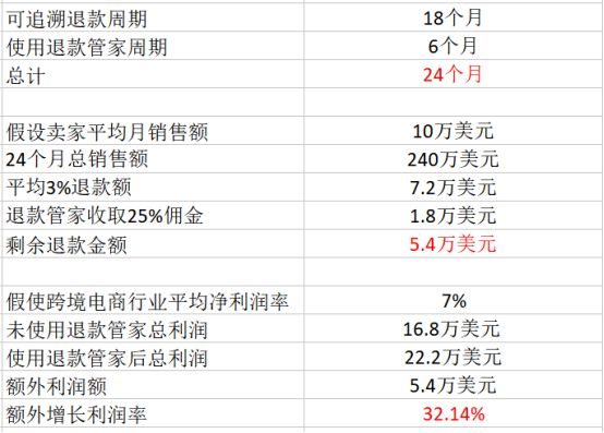 目前,该产品已覆盖超过27种索赔退款情景,可追溯长达18个月的退款周期。重点在于,使用退款管家后,将使卖家全年的收益增长达30%。如下图所示: