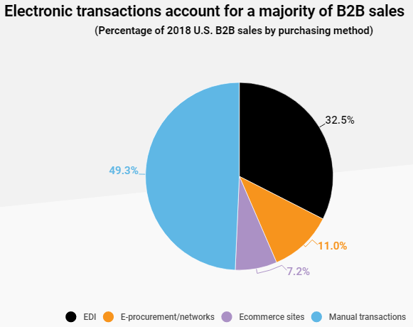 B2BecNews发布了最新2019年美国B2B电子商务市场报告数据,报告中显示:通过B2B电子商务网站,登录门户网站和在线平台进行的美国销售交易增长了11%,达到1.08万亿美元。
