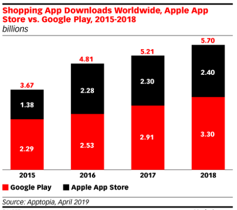 根据美国应用分析平台Apptopia的独家数据,全球范围内的购物应用下载量在2018年达到57亿,比2017年增长9.3%。Google Play商店的购物应用下载量同比增长13.3%,达到33亿,而苹果iOS的下载量同比增长4.2%,达到24亿。