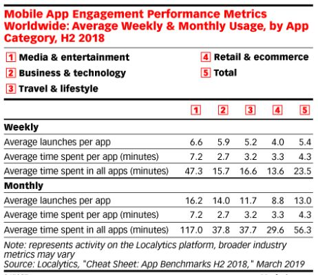 零售和电商类应用平均每个应用每月使用8.8次,每个应用花费3.3分钟。所有类别应用平均每月使用13次,每个应用花费56.3分钟,这是因为媒体和娱乐类应用推高了所有应用的平均花费时间。