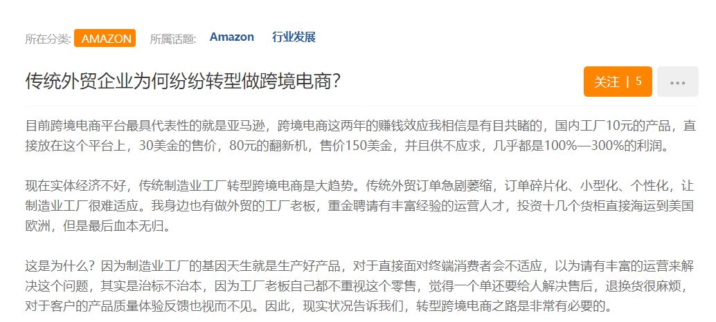 在跨境电商事业进行得如火如荼时,传统外贸在一旁看得越发眼红,就像小朋友吃不到糖那般红着眼。于是跨境圈论坛里对传统外贸如何转型跨境电商的讨论的越发热烈,小编截取了几个关注度比较高的问题: