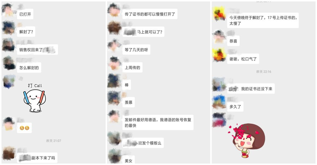 据小编了解,昨晚卖家们在群里讨论德国VAT相关事宜的时候,有位卖家小姐姐称自己的店铺已经恢复正常了,引来一片哗然,好多卖家都问其解决的办法,过了一会儿,又有一位卖家称:“今天傍晚终于解封了。”喜悦之情溢于言表,小编也替他们高兴。
