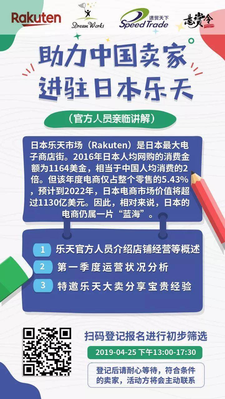 这次,悬赏令为大家带来福利,由速贸天下举办的“入驻乐天线下分享会”将在2019年4月25日在深圳宝安举行。内部名额50位,各位有志进入日本市场的大卖们可以抓紧机会扫码登记,由于名额有限,速贸天下将根据登记条件择优录取,然后逐一联系发送邀请函,请留意微信消息。