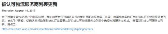 近日,Wish在其官方后台发布消息称,为了持续改善Wish用户的购买体验,其将更新符合确认妥投政策并且配送至美国、法国、德国或英国的订单的被认可的物流服务商列表。并且自8月17日起,受确认妥投政策影响的订单需要从新的被认可物流服务商列表中选择物流服务商发货。