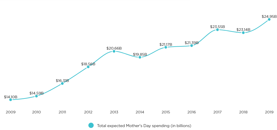 美国零售联合会(NRF)的数据显示,在过去十年里,美国人在母亲节的花费一直在增长,今年他们的母亲节花费将创历史新高——估计达250亿美元。
