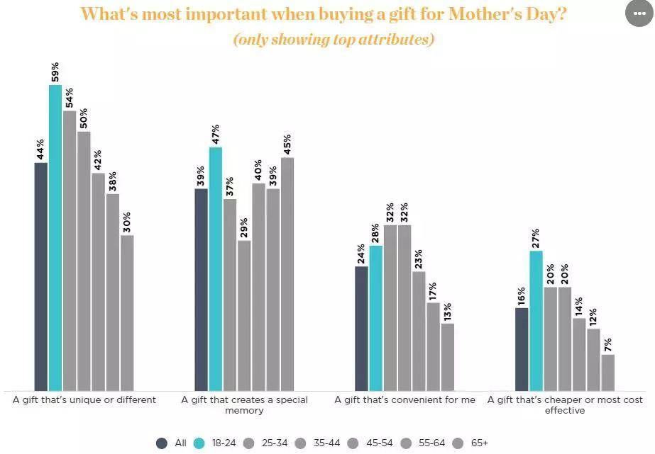 对于25岁以下的年轻消费者来说尤其如此。在为妈妈挑选最完美的礼物时,这些购物者明显比其他年龄段的人更想要一件独特的礼物(59%),并能创造一种特殊的记忆(47%)。