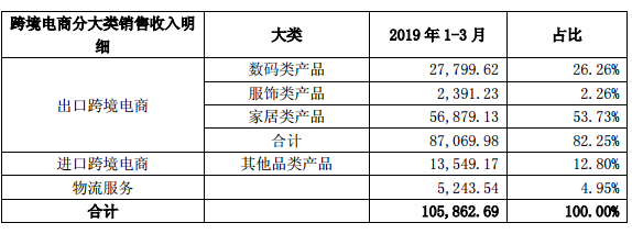 义乌华鼎锦纶股份有限公司发布2019 年第一季度主要经营数据。数据显示,在跨境电商业务板块销售收入中,出口电商占82.25%,约为8.7亿元;进口电商占12.8%,约为1.35亿元;物流服务占4.95%,约为0.5亿元。