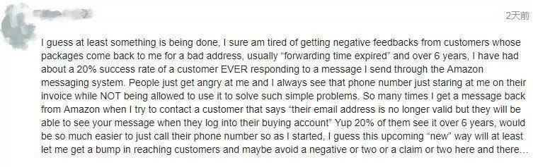 一位卖家言语之间的喜悦之情简直要溢出屏幕了,他表示:“我已经烦透了因为填错地址退货而导致的差评,6年了,我通过亚马逊的消息服务发出的信息大概只有五分之一的客户回应。客户很生气,而我很无奈,我只能眼睁睁地看着发票上的电话号码,却不能用这些号码来解决如此简单的问题。亚马逊回复我说:’他们的邮件虽然无效了,但他们登录后就能看得到发给他们的信息。’”