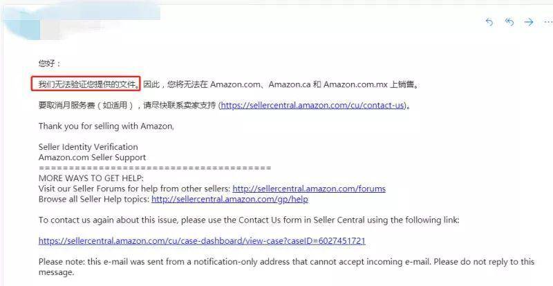 事情的具体经过为:这位卖家打算注册亚马逊美国站,就花了800块钱在服务商手中购买了一份资料,注册的时候却显示购买的资料有问题。根据亚马逊回复的邮件显示,亚马逊无法验证卖家提供的邮件,宣判注册失败。