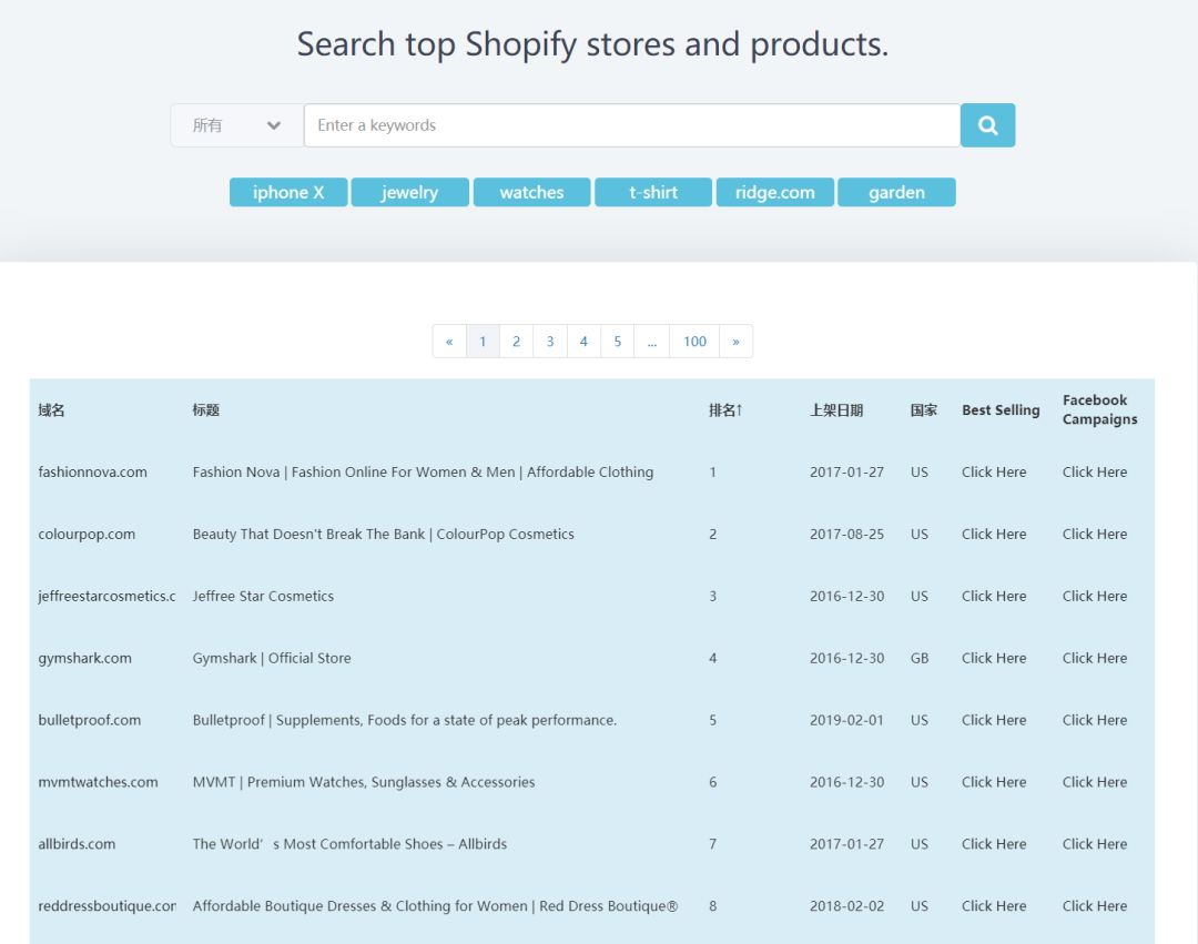 200w的Shopify数据店铺信息,目前你可以根据关键词搜索出相应的店铺,查看他们的标题,最快的效率,在facebook的上查询,如下图: