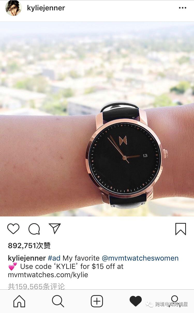 当中,最成功的,莫过于早在2016年,MVMT找到网红家族卡戴珊家族的“卡小妹”Kylie Jenner在Instagram上做内容发布。这条内容清晰地展示了手表及品牌,并且为Kylie准备了特定的销售网页,附有15% off的折扣码。这条INS累计已有近90万个点赞以及近16万条评论。如今,“卡小妹”个人Instagram粉丝已过亿,在年轻人心目中影响力超大,是史上最年轻的白手起家十亿富豪。