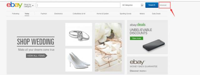第一步:进入目标国家站点,点击eBay页面右上方的【Advanced】,进入高级搜索页面,以美国站为例。