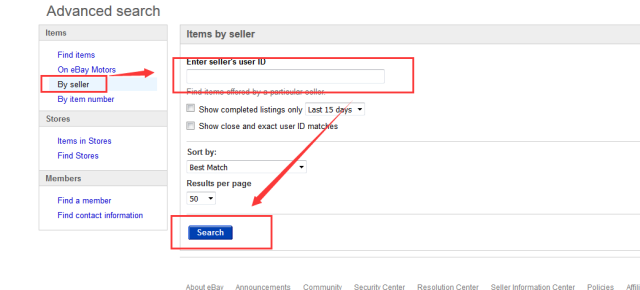 第二步:在高级搜索页面,点击页面左侧边栏中的【By seller】,进入“依卖家搜索”页面,在【Enter seller's user ID】下的文本框中输入自己的卖家账号,然后再点击【Search】,就可以在eBay的搜索页面查看到自己在此站点刊登的全部上线物品。