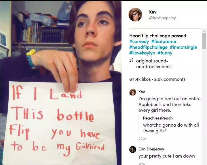 去年10月,他为了好玩下载了这款应用程序,并上传了一段瓶子翻转的视频。在视频中,他举起一张纸,上面写着“如果我把瓶子翻转过来,你要成为我的女朋友”。