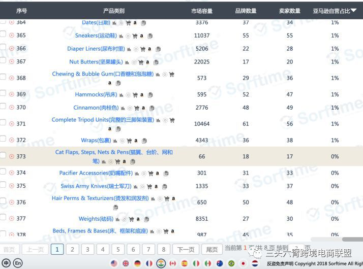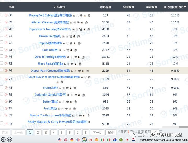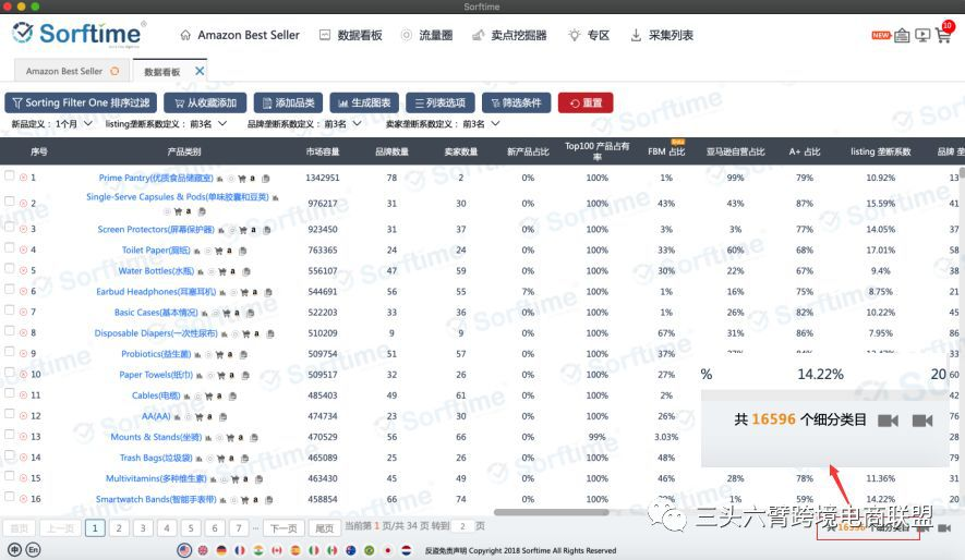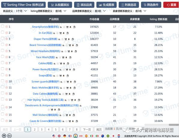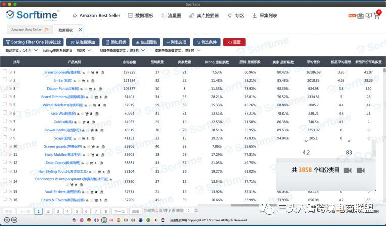 上面两张图来自 Sorftime 数据看板,分别列出了亚马逊美国站和印度站所有底层类目,从图表右下方可以看到,美国站一共有16596个细分类目,而印度站只有3858个细分类目。