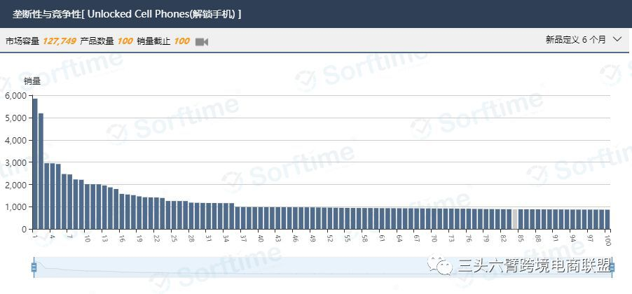 上面两张图都是智能手机 TOP100 市场 listing 分布柱状图,图一反应了美国市场该类目销售情况,图二反应了印度市场该类目销售分布,当我们在两张图右上方定义新品为6个月时,此时图中灰色柱状图代表新品,图一美国站灰色柱状图少新品少,图二灰色柱状图多代表新品多。
