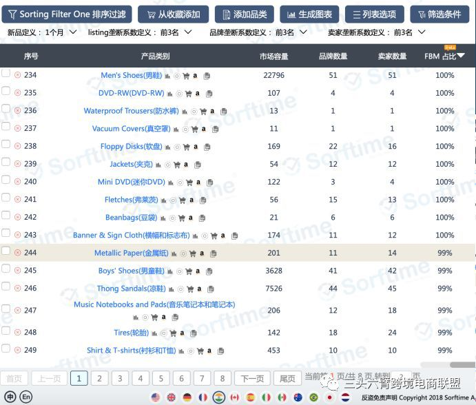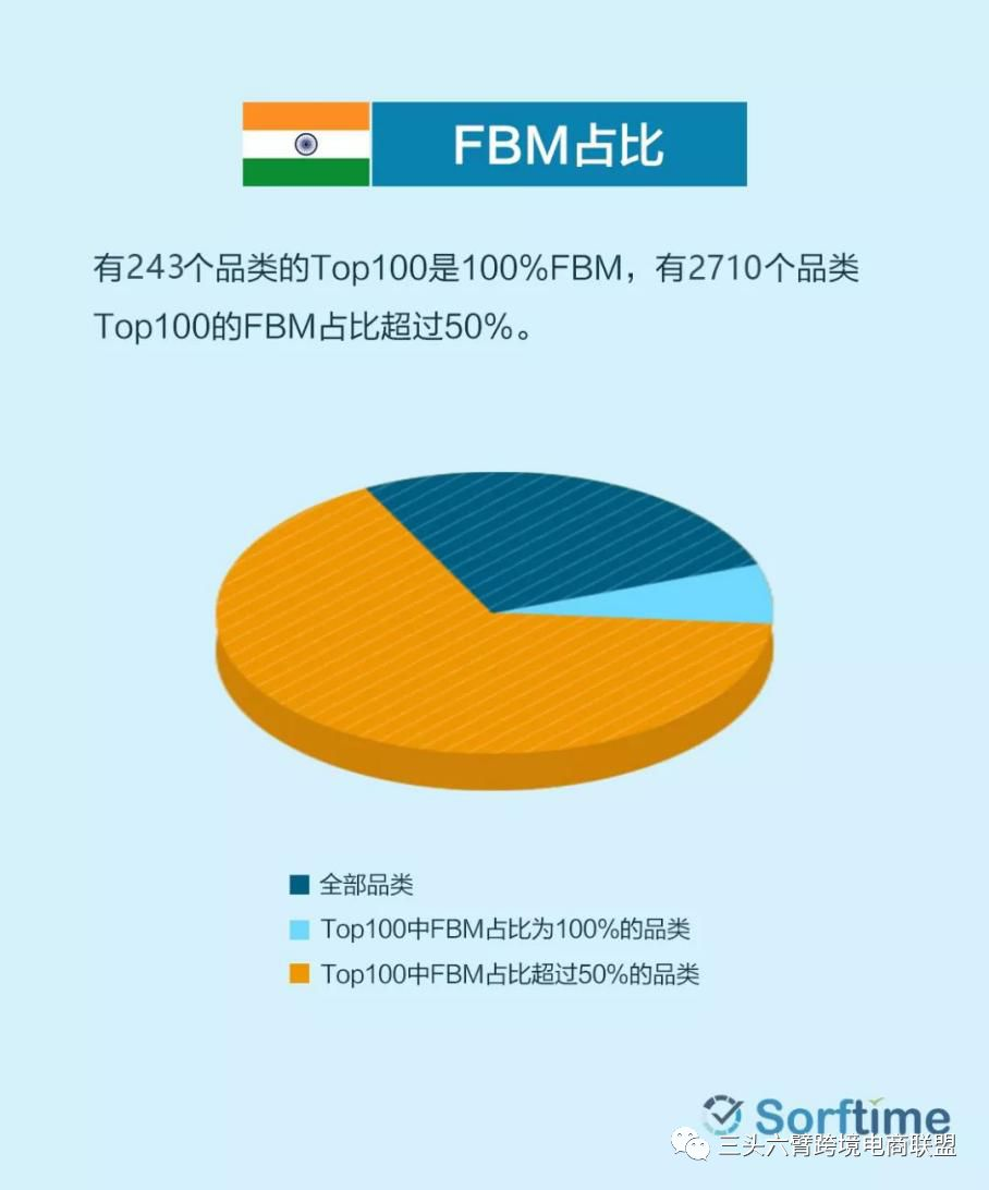 在Sorftime数据看板中选中亚马逊印度站所有品类,按照FBM这一维度进行降序排列,图一中发现在排名244的类目之前,FBM 占比100%,图二发现,在排名2711的类目之后,FBM 占比低于50%。