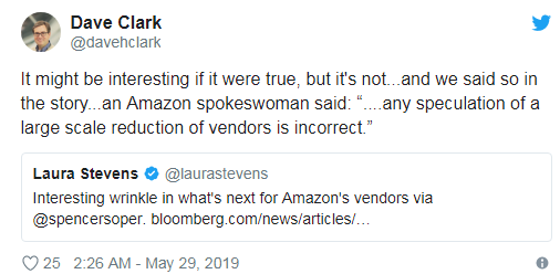 亚马逊发言人在一份电子邮件声明中表示:“作为我们正常业务的一部分,我们会根据个人情况审查我们的销售合作伙伴关系,任何对大规模减少供应商的猜测都是不正确的。”