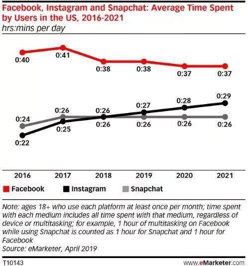 随着Facebook日均使用时间的下降,美国人使用Snapchat和Instagram的频率在增加。