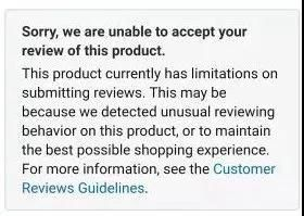 单个产品每日的直评数量被亚马逊限制为3条,VP的数量则限制为6-8条。当产品的评论值超过这个数量之后,Listing则会被亚马逊自动屏蔽。买家留评用户将会收到如下信息。