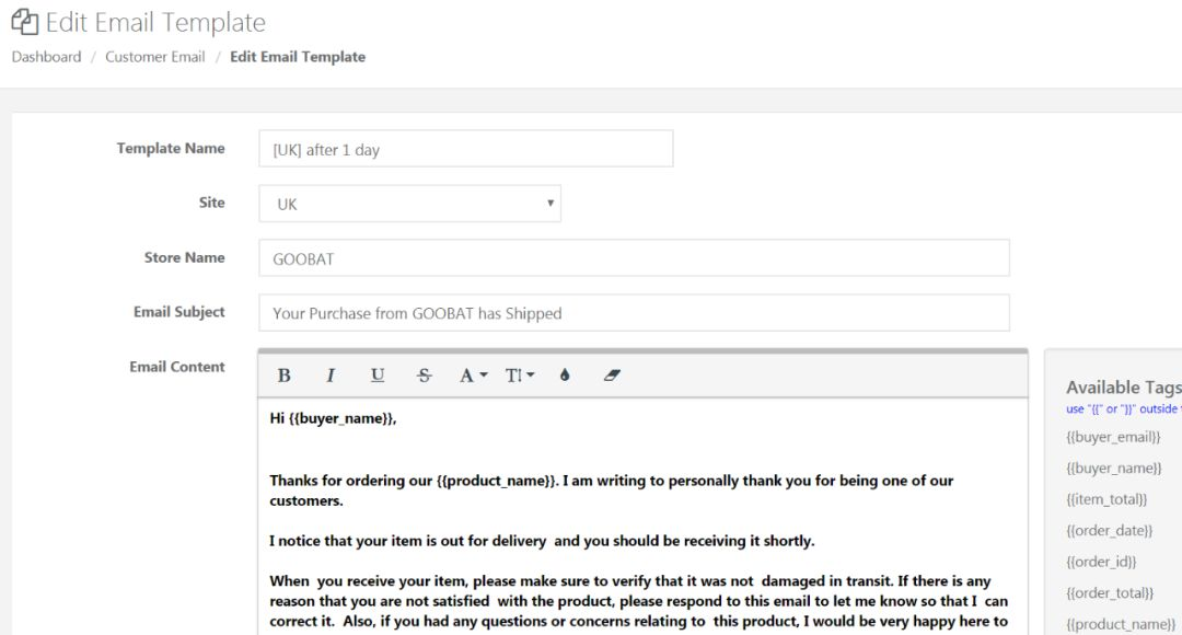 同时可以在邮件里插入Tags来自动抓取要发送订单的具体信息,例如买家名字,产品名,订单号等等,制作个性化买家邮件。