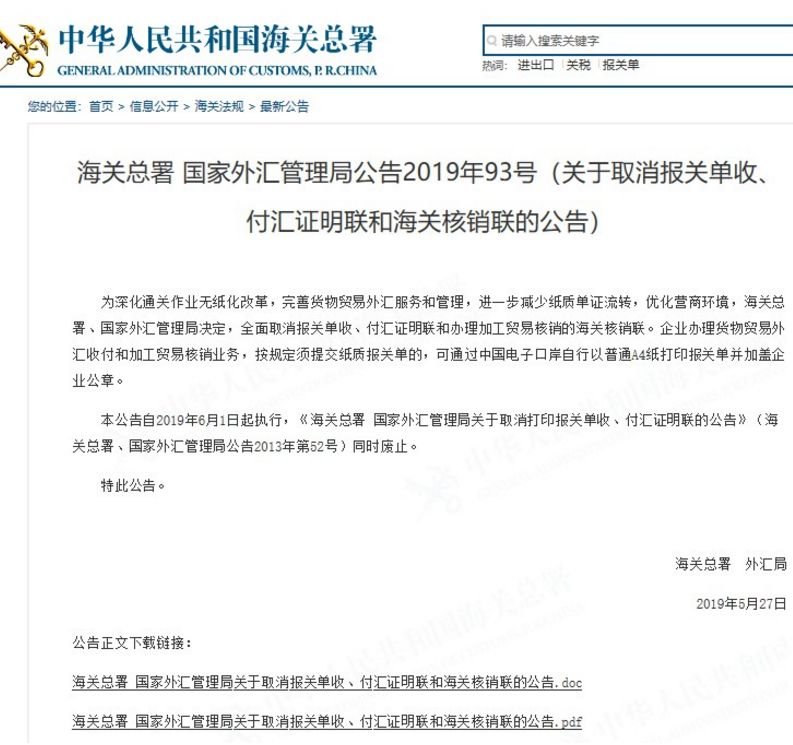 5月29日消息,为深化通关作业无纸化改革,完善货物贸易外汇服务和管理,进一步减少纸质单证流转,优化营商环境,海关总署、国家外汇管理局决定,全面取消报关单收、付汇证明联和办理加工贸易核销的海关核销联。