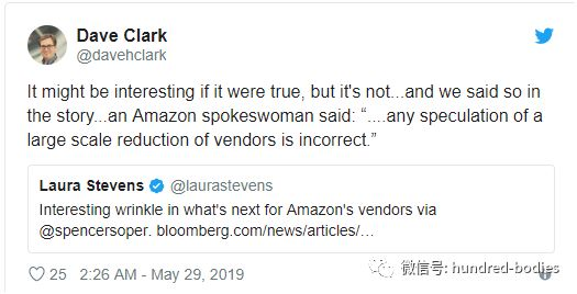 5月29日,亚马逊全球运营高级副总裁Dave Clark发布推文表示:“如果是真的那就有意思了,可惜它不是……我们在之前的邮件声明也是这么说的,声明中亚马逊发言人说过‘任何关于大规模减少VC卖家的猜测都是不正确的’。”