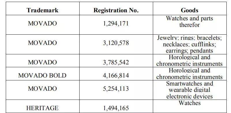 本案的起诉理由为商标侵权,品牌权利人注册的商标名称有:MOVADO、MOVADO BOLD、HERITAGES、MUSEUM、VIZIO、ELIRO、ESPERANZA、AMOROSA、RED LABEL、SERIES 800等。卖家们需要自查产品详情,标题,产品包装等,任何使用了以下商标名称的行为都属于商标侵权。