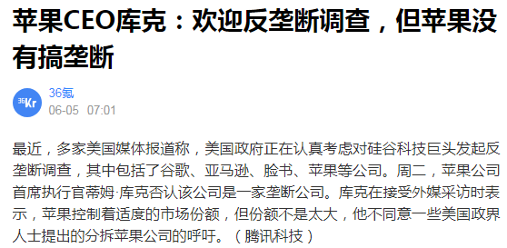 其实Mark感觉去年的贝老爷的离婚案就是他自编自导的故事,Mark长这么大,也好几十岁的人了,就没发现过一起离婚事件处理得那么愉快的,而且那些花边故事完全就只是几张照片一起参加一下社交活动啥的,Mark一直感觉是贝老爷因为亚马逊市值变成世界第一后让他也顺便成为了世界首富,这个时候精明的贝老爷觉得很可能会被反垄断调查,所以提前做了准备和布局。所以昨天股价往下跌的幅度,其实亚马逊不是很大。而苹果跌幅不大的原因确实是因为苹果貌似真的没有以前那么犀利,不仅三星很强,华为在其他市场也很强。所以,库克说,欢迎来调查,好吃好喝伺候啊。但其他几家真的很紧张,比如Google、Facebook、Amazon。