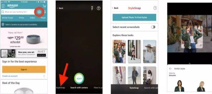 想使用StyleSnap,用户只需要点击亚马逊APP右上角的摄像头图标,选择“StyleSnap”选项,然后上传一张你喜欢的服饰的照片或截图,StyleSnap就会向你推荐亚马逊网站上与照片相匹配的类似商品。在提供推荐时,StyleSnap会考虑各种因素,比如品牌、价格范围和客户评价。