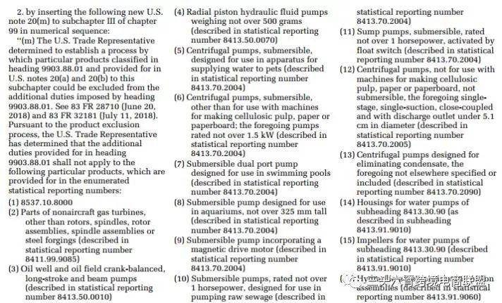 此次排除的340亿清单中涉及非航空器燃气轮机部件、离心泵、潜水器、汽车塑料储罐、独立制冰机、打桩机等。