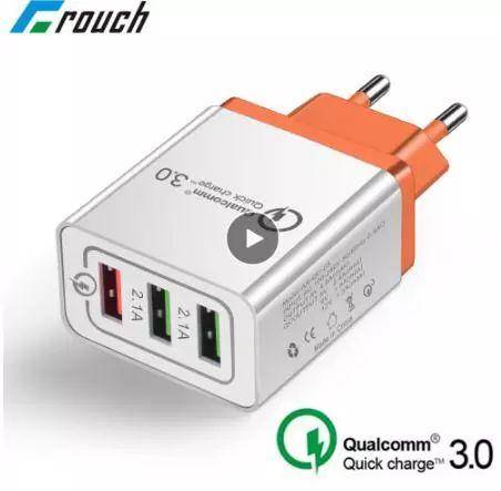 这个插头上有3个插孔,输出功率各不相同,试用于不同品牌的手机,包括苹果、三星和华为等,7种颜色可选,欧盟和美国适用。