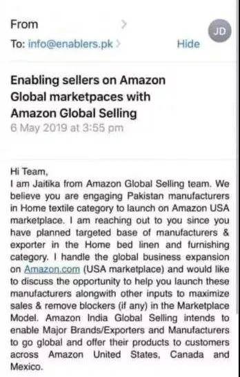 下图是来自亚马逊全球开店团队的 Jaitika 写给 Enablers.PK 的邮件,而 Enablers.PK 则致力于帮助巴基斯坦制造商在亚马逊美国站上开店。