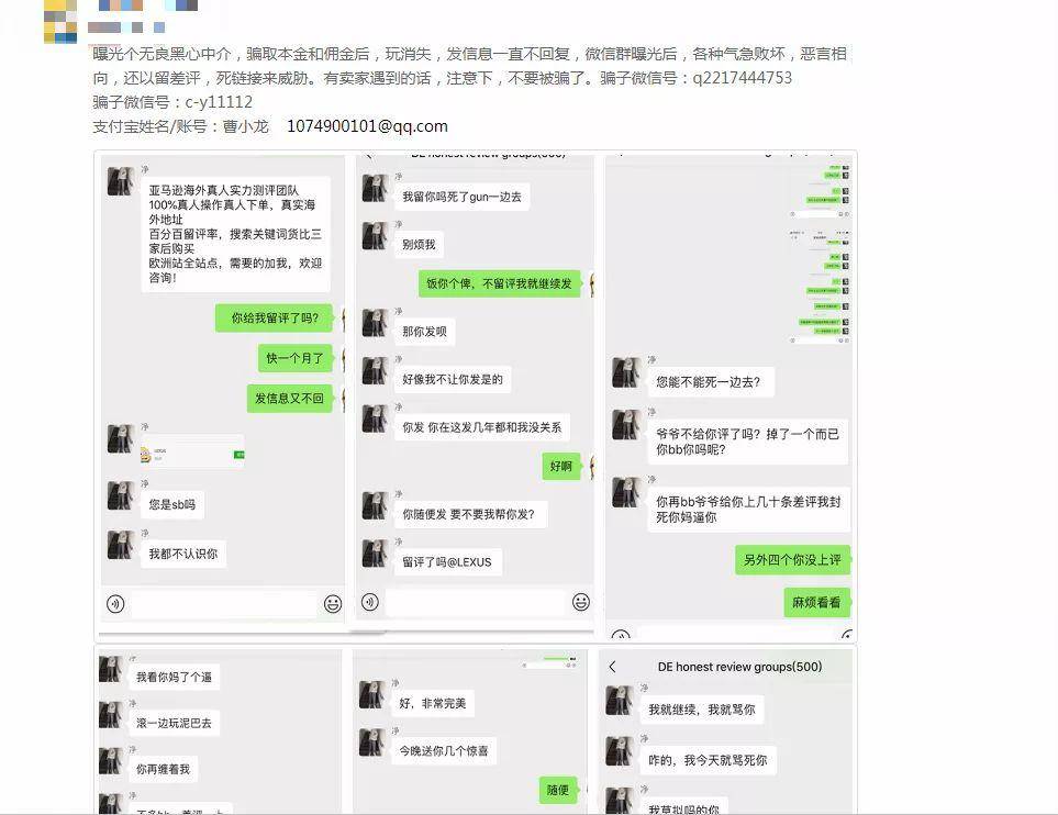 有些卖家急于求成,找人刷单、刷好评,妄图通过“捷径”提高店铺曝光率,以增加盈利。然而,却有卖家因此“赔了夫人又折兵”,不仅单没刷成,反而被骗佣金和手续费。据一位卖家称,有个中介在骗取本金和佣金后立马“消失”,发信息一直不回复,该卖家将其在微信群曝光后,收到了骗子的恶言相向,还以留差评,死链接来威胁。